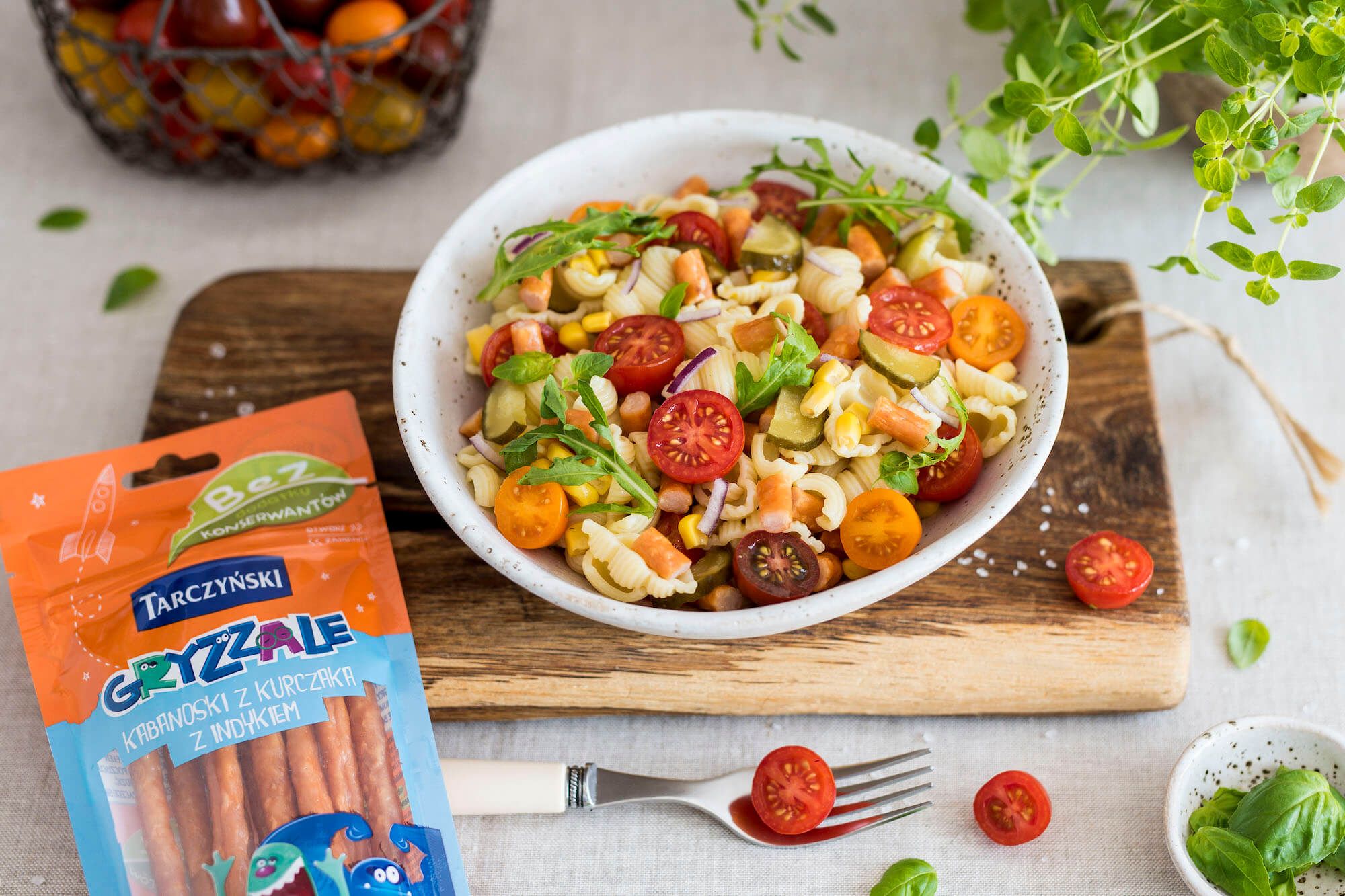 Pokrój kabanoski na mniejsze kawałeczki i wrzuć do miski z makaronem. Następnie dodaj pokrojone na pół pomidorki, posiekaną cebulkę i pokrojone w kostkę ogórki. Odcedź kukurydzę i wsyp ją do miski. Na koniec dodaj garść rukoli i wszystko wymieszaj.